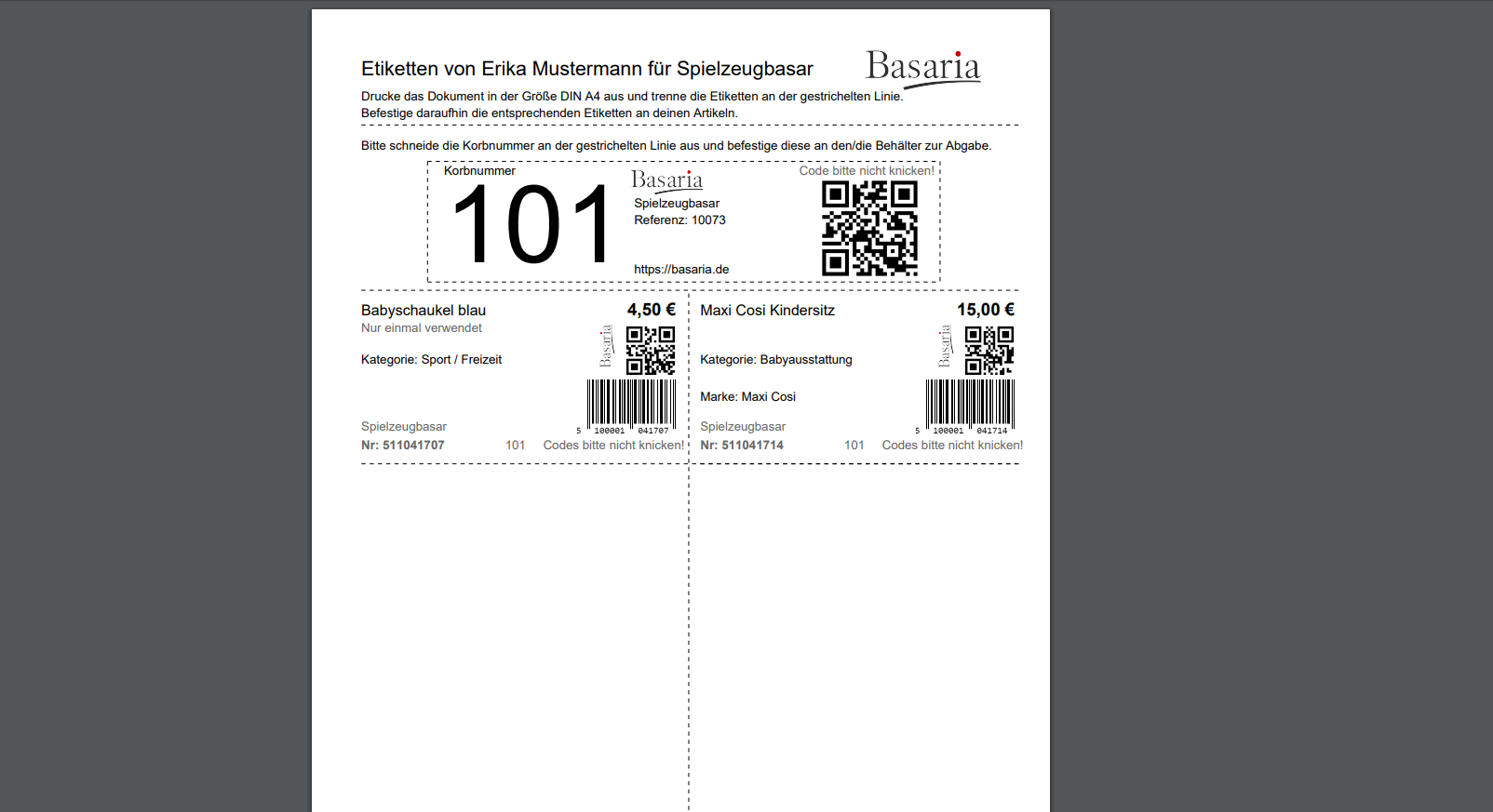 Artikel einem Basar zuordnen und Etiketten drucken